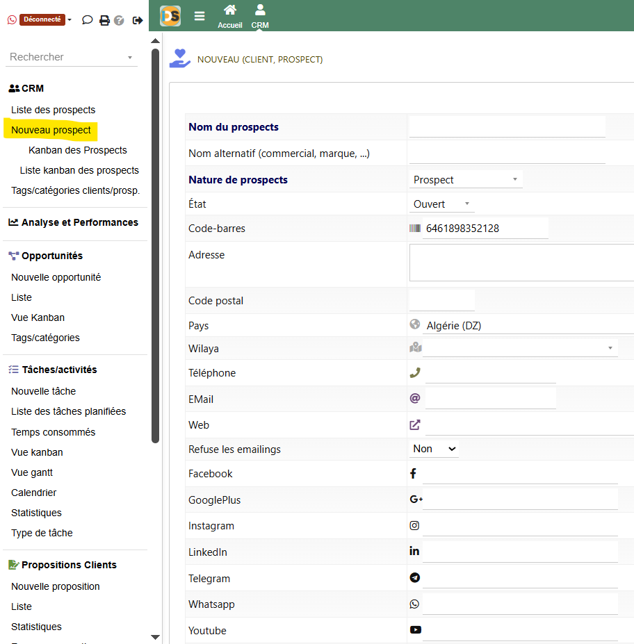 Pour commencer, ouvrez le module (CRM), puis cliquez sur le bouton « Nouveau prospect » situé en haut à gauche. Cela affichera un formulaire vierge.